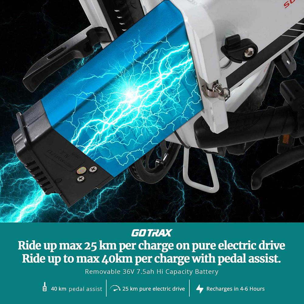 Jusqu’à 50 km par charge. – Avec une batterie amovible haute performance de 36 V 7,5 Ah, le vélo électrique peut parcourir jusqu’à 50 km avec une assistance au pédalage ou 24 km en appuyant uniquement sur l’accélérateur.